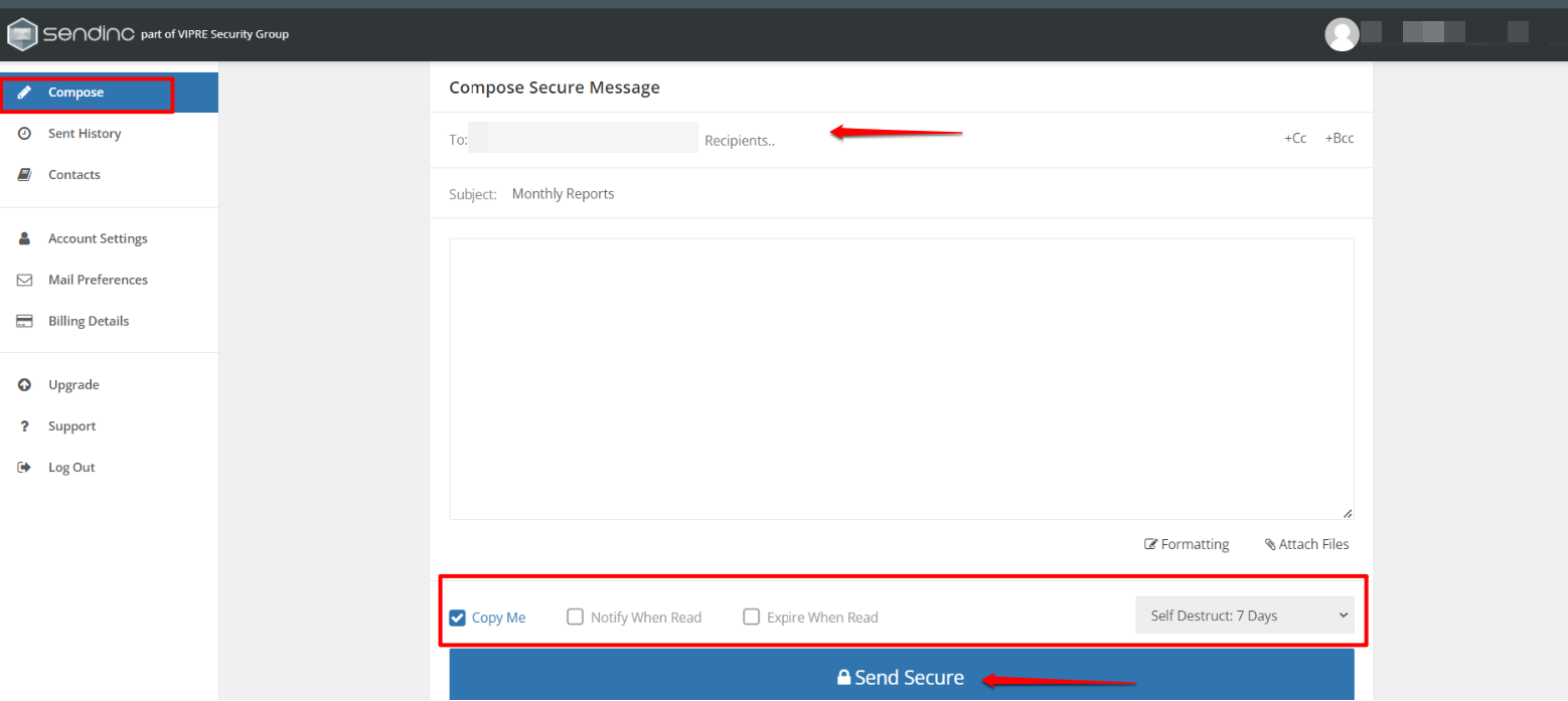 Input the recipient's name and subject, draft the email, and click "Attach Files" if needed. With a Pro or Corporate account, you can choose to have the message expire once it is read and to receive a notification when it is read. You can also adjust the self-destruct duration. Finally, click "Send Secure" when finished. Afterwards, you'll receive a prompt confirming the successful message delivery.