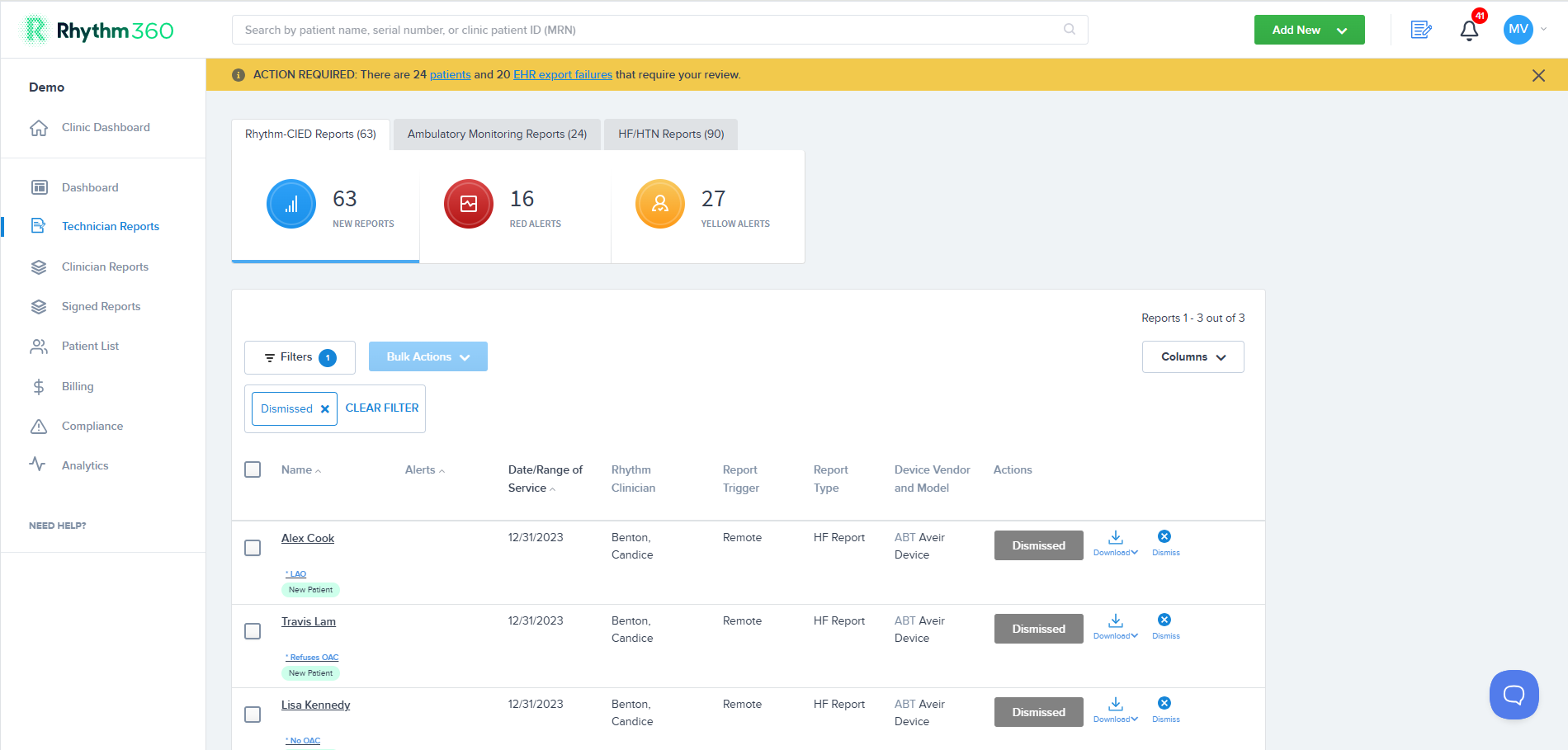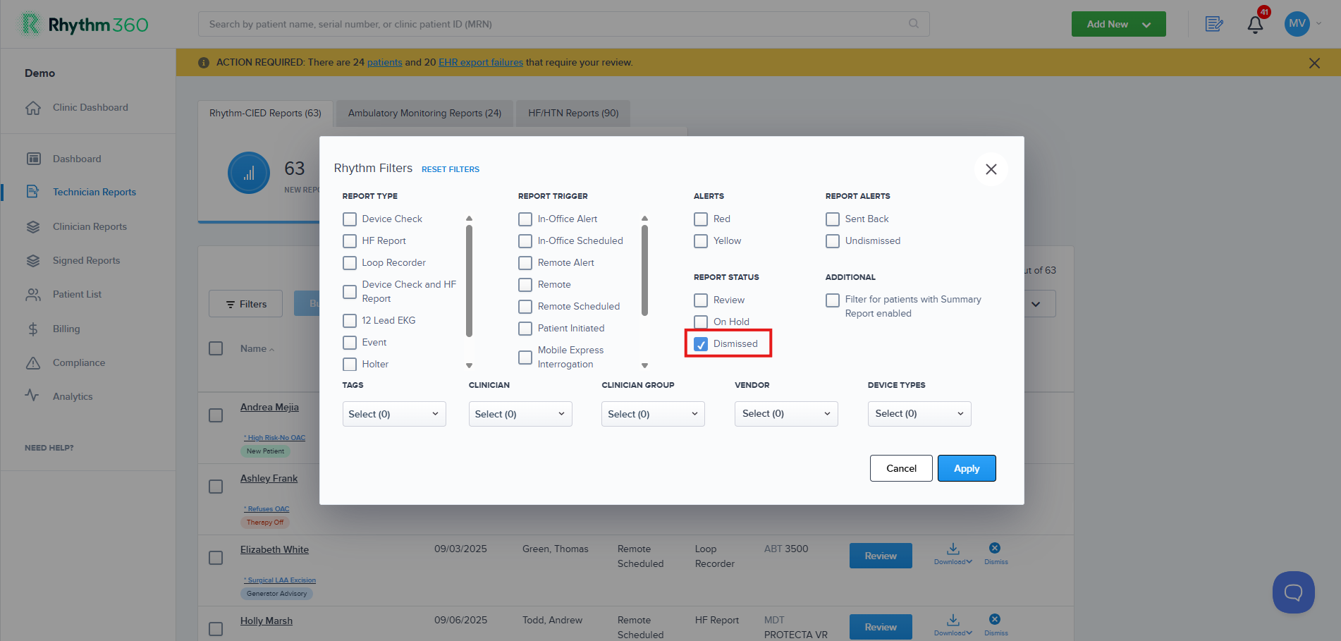 If you would like to see more than one patient's dismissed/archived reports, you can do so from the Technician/Clinician Reports dashboard. You must apply certain filters on the dashboard to view these reports. You cannot undismiss or unarchive any reports from the reports dashboards.